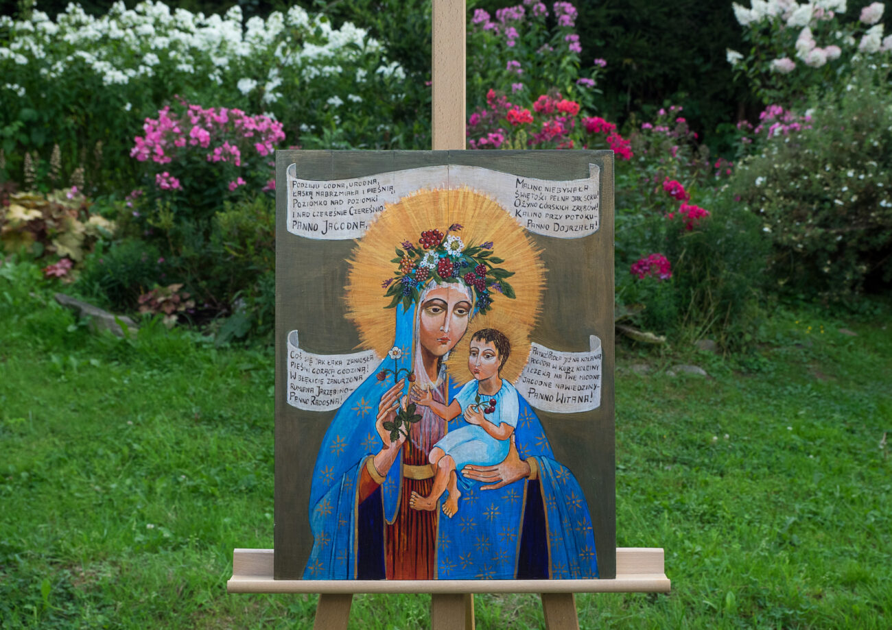 Ikonom malowanym przez Jolę towarzyszą wiersze Beaty Obertyńskiej, zapomnianej mistrzyni słowa, łączącej tak pięknie nasze swojskie święta z opowieścią o życiu Matki Bożej.